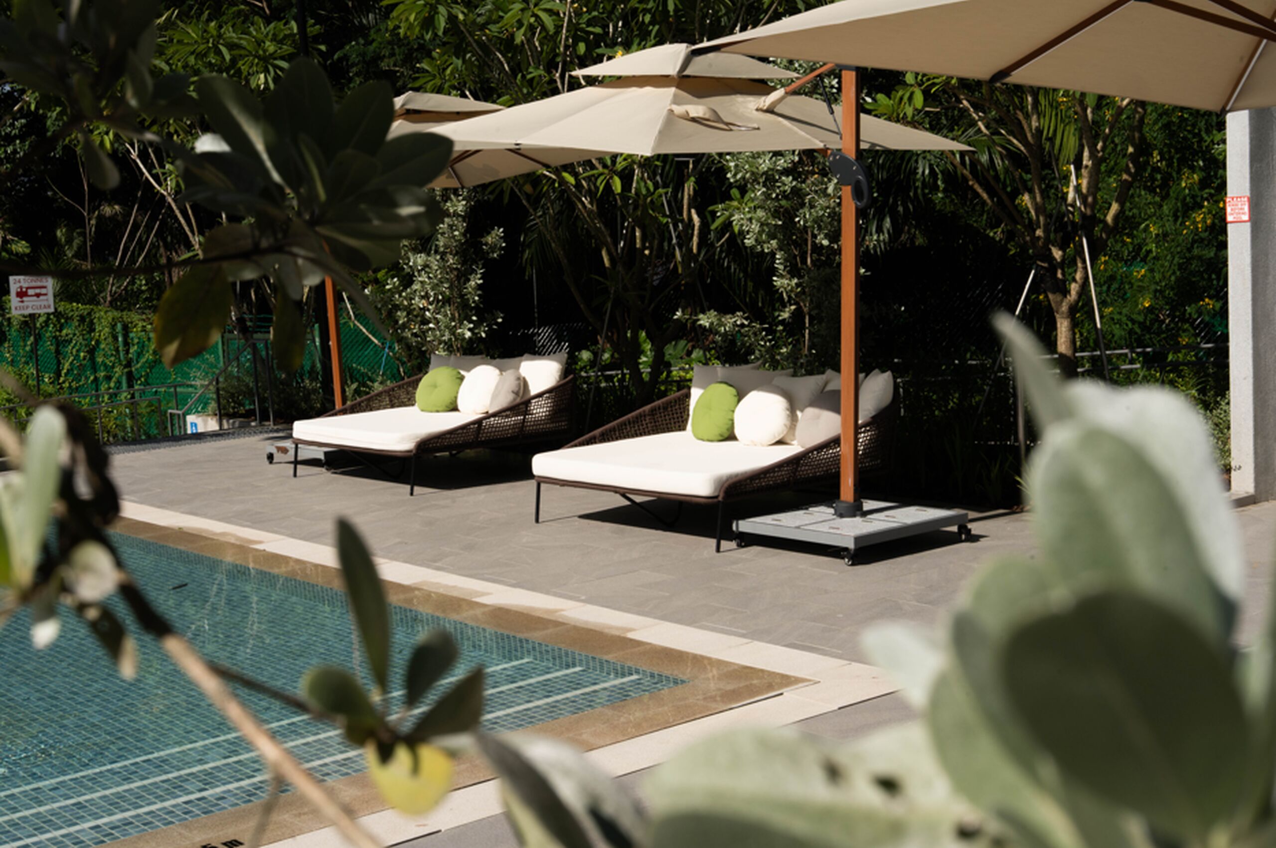 At the Pool Deck, which now occupies what was once a basketball court, Grant Associates embraced the site’s steep terrain to create a 25-metre infinity-edge lap pool flowing elegantly into a children’s pool below. The deck uses natural timber with stone edging, and blue tiles in the pool reflect the sky — creating a calming blue-green contrast against the lush tropical planting.