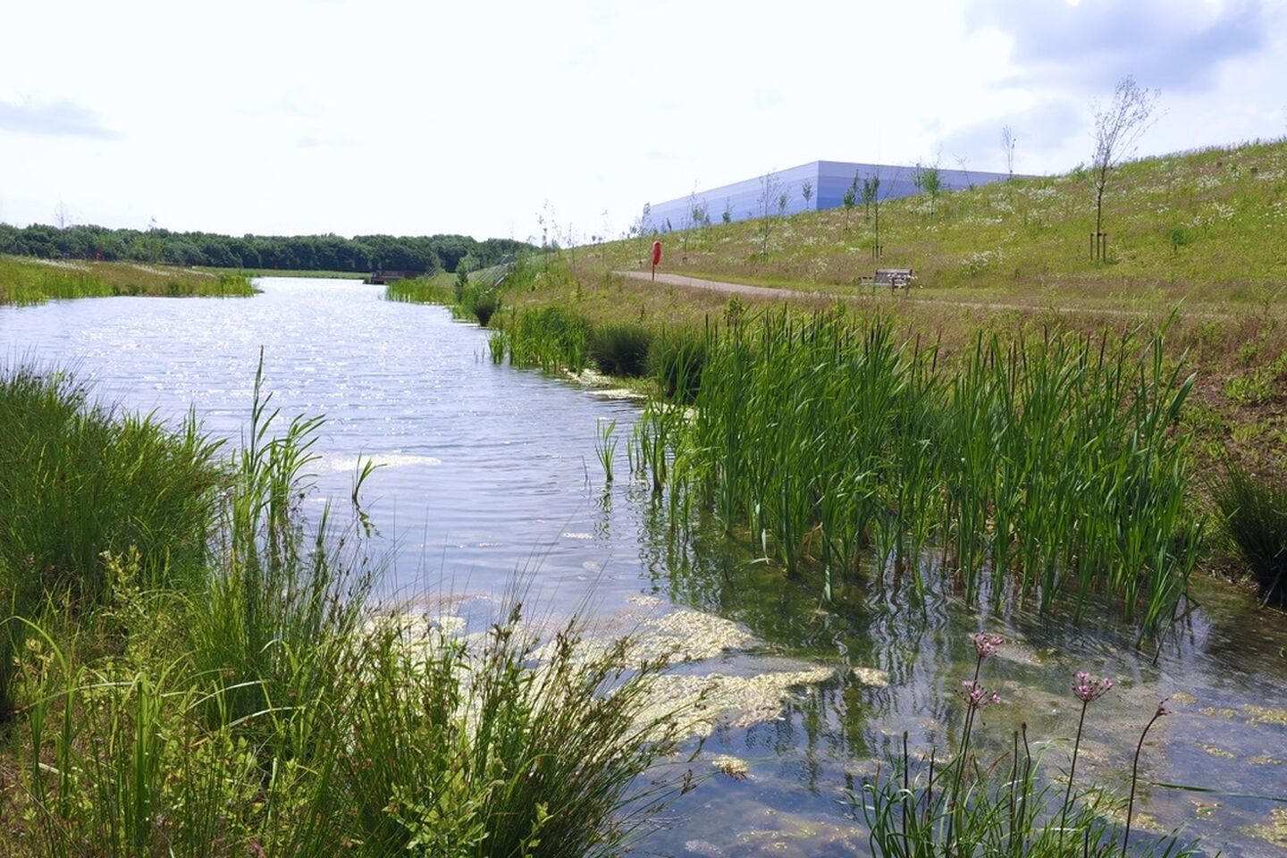 At Magna Logistics Park the positive landscape features include a protected country park area including preserved heritage, retained watercourses and water quality through new aquatic and wetland habitats, meadow and pastureland. Biodiversity has been increased, and the extensive planting proposals are supporting a targeted net reduction in carbon emissions. Tree planting on landscaped banks is supporting new habitat linkages, enhancing visual screening from the A5, and helping to reveal heritage features. The wider proposals are also starting to support a number of leisure and amenity benefits for the wider community.